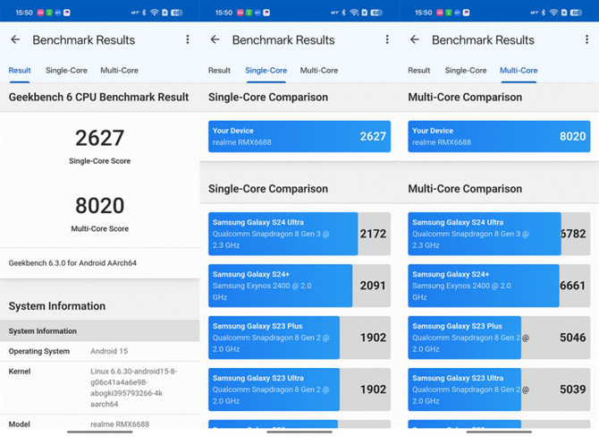 GeekBench 6测试中,真我GT7的单核心得分为2627,多核心得分为8020,大幅领先上代旗舰级平台,同样达到现阶段的旗舰级水准。