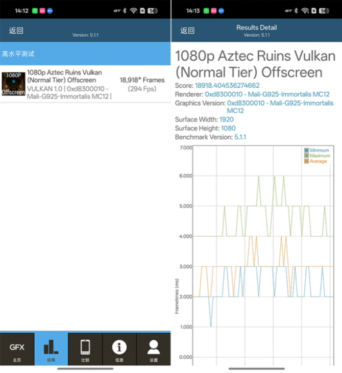 GfxBench测试中,1080P的 Aztec Ruins Vulkan offscreen测试中,平均渲染帧数达到294FPS,渲染帧数为18918,这样的成绩同样是达到旗舰级的水准,性能表现突出。