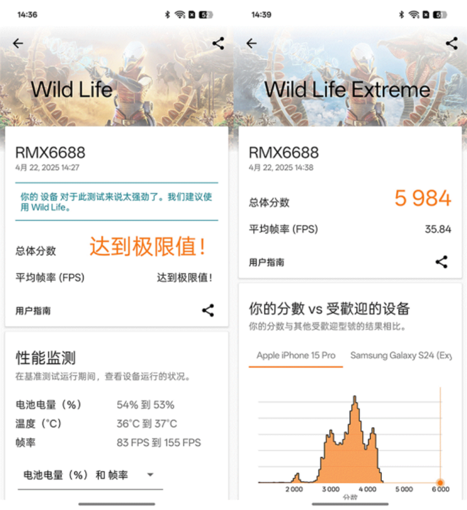3DMARK是一款非常经典的图形类测试软件,在Wild Life测试中,帧数已经突破上限值,而在Wild Life Extreme测试中的总体分数为5984,平均帧数为35.84FPS,分数表现非常出色,大幅领先同类竞品,图形性能表现优秀。