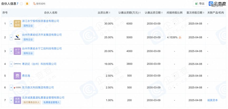 合伙人信息显示,该基金由浙江永宁股权投资基金有限公司、台州市黄岩经济开发集团有限公司、台州市黄岩永宁工投科技有限公司、寒武纪旗下寒武纪(台州)科技有限公司等共同出资。