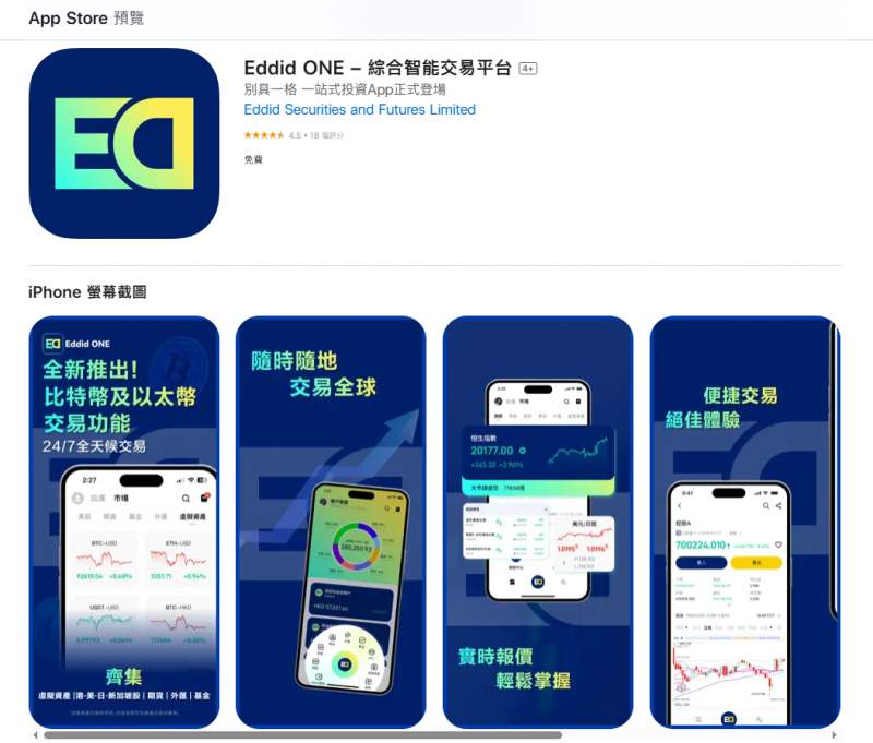 目前,Eddid ONE已在全球30多个市场的App Store及Google Play上架,下载量突破百万,成为香港少数支持港股、美股、日股、新加坡股、期货及基金的全能智能交易应用程序,也是众多投资者实现财富增值的得力助手。