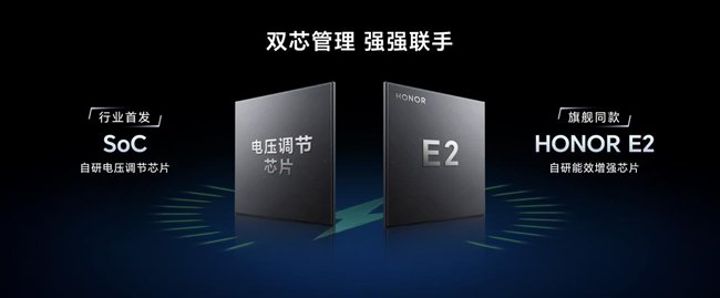荣耀GT Pro还行业首发了SoC电压调节芯片,通过智能调节SoC的电压,助力SoC持久发挥超强实力,实现等效电量增加超过200mAh。搭配旗舰同款的自研能效增强芯片HONOR E2,双芯管理强强联手,带来全场景全天候更优续航体验。