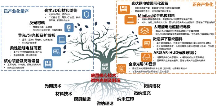 苏大维格及子公司深耕高端微纳光学材料及反光材料制品多年,已发展形成了公共安全和新型3D印材、消费电子新材料、高端智能装备、反光材料四大事业群,并凭借强大的技术研发实力,在纳米波导光场镜片(AR/AR-HUD)、虚实融合透明显示、裸眼3D显示、光栅及光栅尺、无掩膜光刻等领域持续研发,进行技术与专利布局,不断开发新产品,拓展新领域。