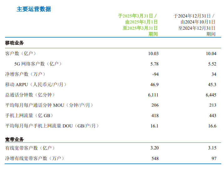 个人市场方面,中国移动加快构建基于细分市场、细分客户、细分场景、细分需求的运营体系,持续深化存量经营、价值经营,大力加强产品供给、产品创新。截至2025年3月31日,移动客户总数10.03亿户,其中5G网络客户数达到5.78亿户;首季度,手机上网流量同比增长7.7%,手机上网DOU达到16.1GB,同比增长8.0%;移动ARPU为人民币46.9元。