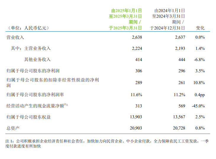 近日,中国移动发布2025年第一季度报告。报告显示,今年一季度,中国移动营业收入为2638亿元,其中主营业务收入2224亿元,同比增长1.4%;归属于母公司股东的净利润306亿元,同比增长3.5%;其他业务收入为414亿元,同比下降6.8%。