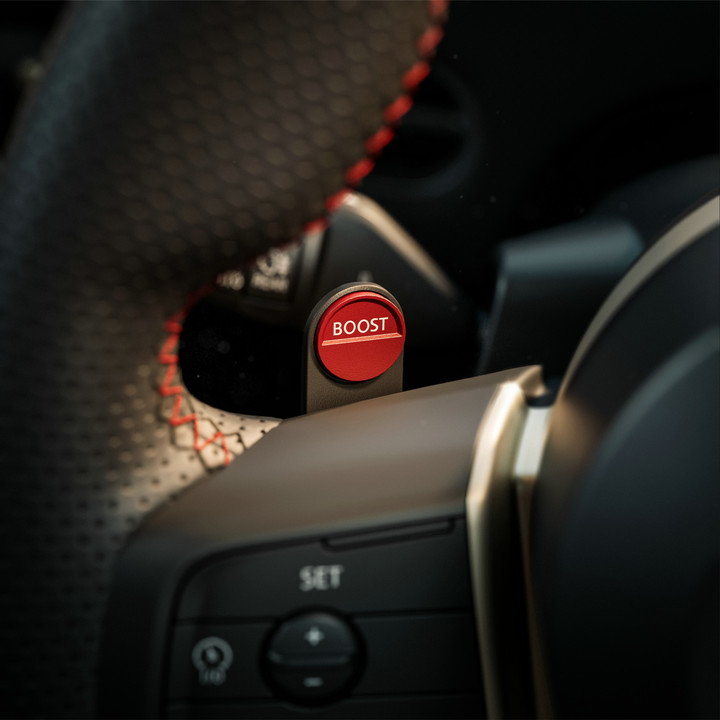 而在直道,MINI JCW 准备了一台功率为 190kW 的碳化硅电机,峰值扭矩为 350N·m。另外,拨动方向盘后的 Boost 拨片,车辆会额外提供 20kW 的动力,并持续 10 秒,零百加速时间为 6.9 秒。