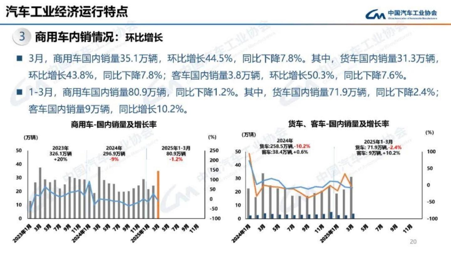 经历深度调整的商用车市场初现复苏迹象,一季度产销同比微增1.8%。其中客车表现优于货车,产销增幅接近10%,皮卡市场保持14.9%的稳健增长。出口端呈现爆发态势,3月商用车出口9.6万辆创历史同期新高,重卡、轻客等产品在”一带一路”市场获得突破。