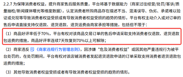 而像抖音则在规则中写清楚了,如果商品好评率低于70%,用户发起仅退款、退货包运费等,平台会直接支持。