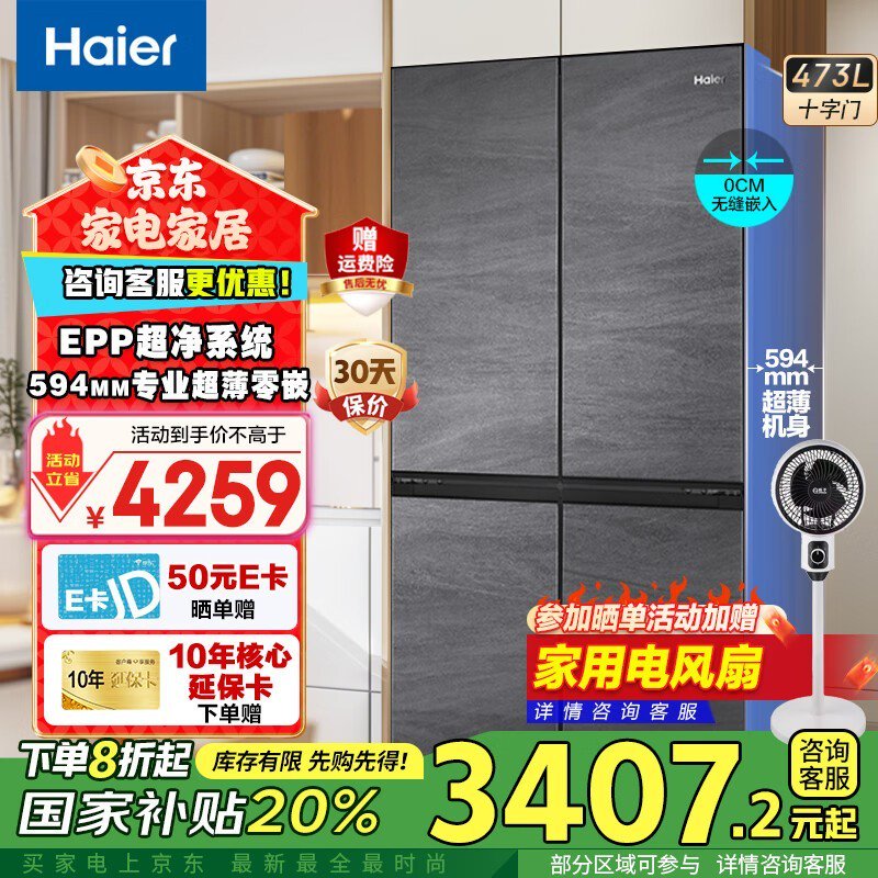 海尔473L十字对开门冰箱BCD-473WGHTDB9S8U1大容量嵌入式设计促销