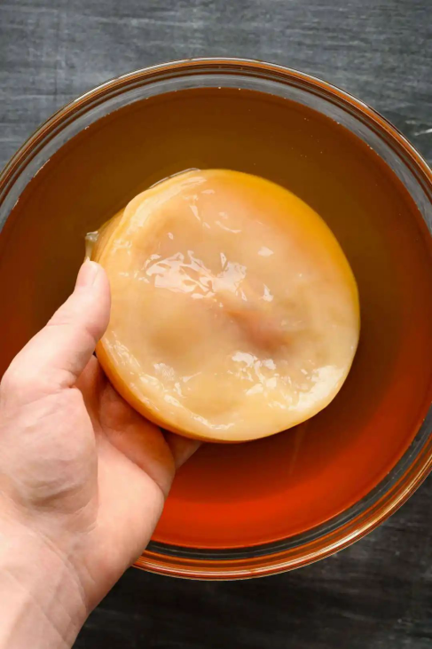 它长得像一块肥肉,摸起来像一块魔芋。发酵完茶水倒出后,这块菌母还能继续使用,而且会越长越大,甚至还能切分繁殖——只要定期加新茶水和白糖,它就能一直活下去。