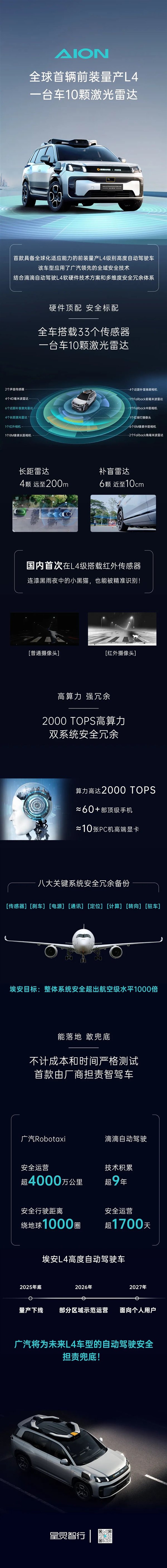 该车型搭载了高达2000TOPS算力的中央大脑,更有刹车、传感器等八大安全冗余备份,单系统失效也能正常行驶。埃安的目标是整体系统安全超出航空级水平1000倍。
