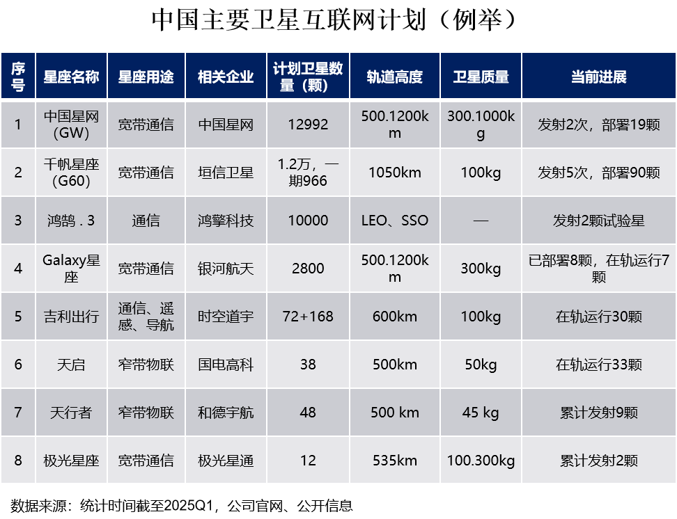 SpaceX的Starlink。SpaceX与OneWeb(已被Eutelsat合并)公司的低轨卫星互联网星座计划进度较快,已进入应用组网阶段,具备了商业化应用的基础。特别是SpaceX的Starlink,截至2025Q1,已累计发射8094颗,2024年Starlink收入78亿美元,较2023年增加169%,活跃用户达到460万个。其他国家的星座建设计划处于建设早期阶段。