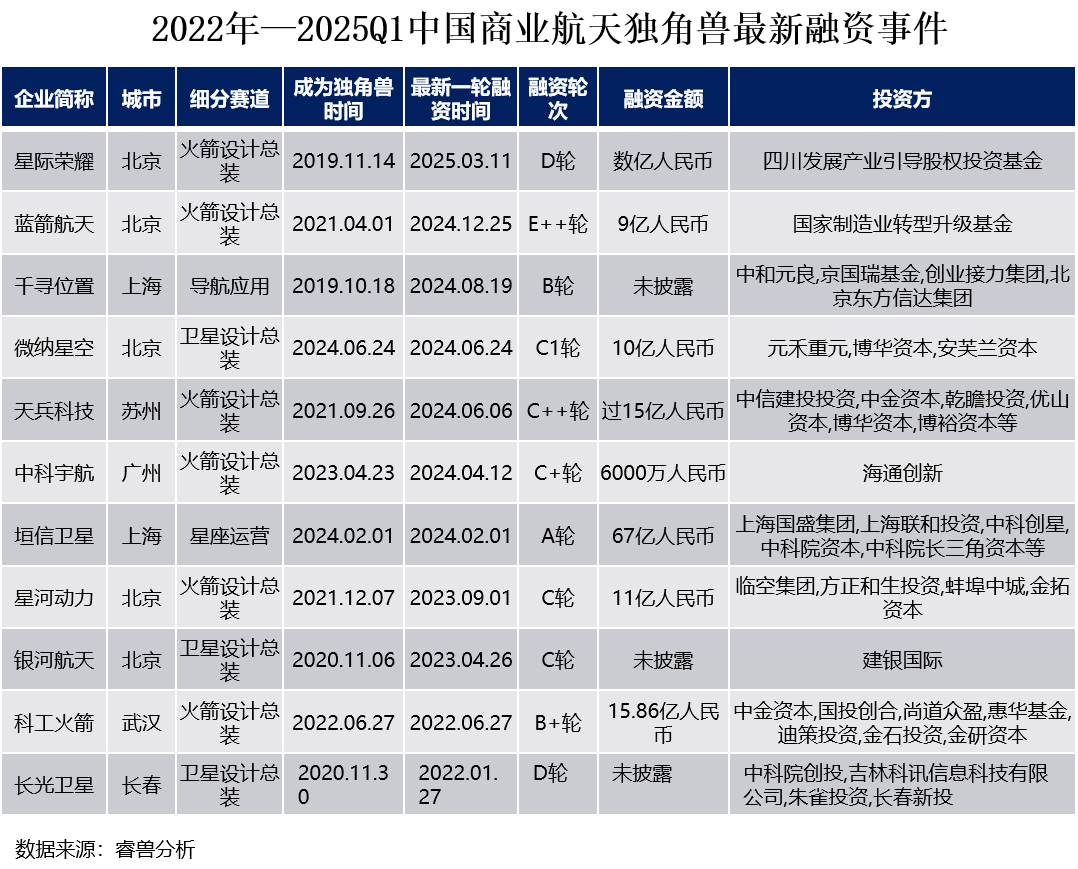 火箭设计总装、卫星设计总装赛道。2024年新晋2家独角兽,垣信卫星、微纳星空。截至2025年Q1,商业航天领域有12家独角兽,集中在火箭设计总装(6家)、卫星设计总装(4家)赛道。除时空道宇外,其他11家独角兽均在近3年内获得最新融资。