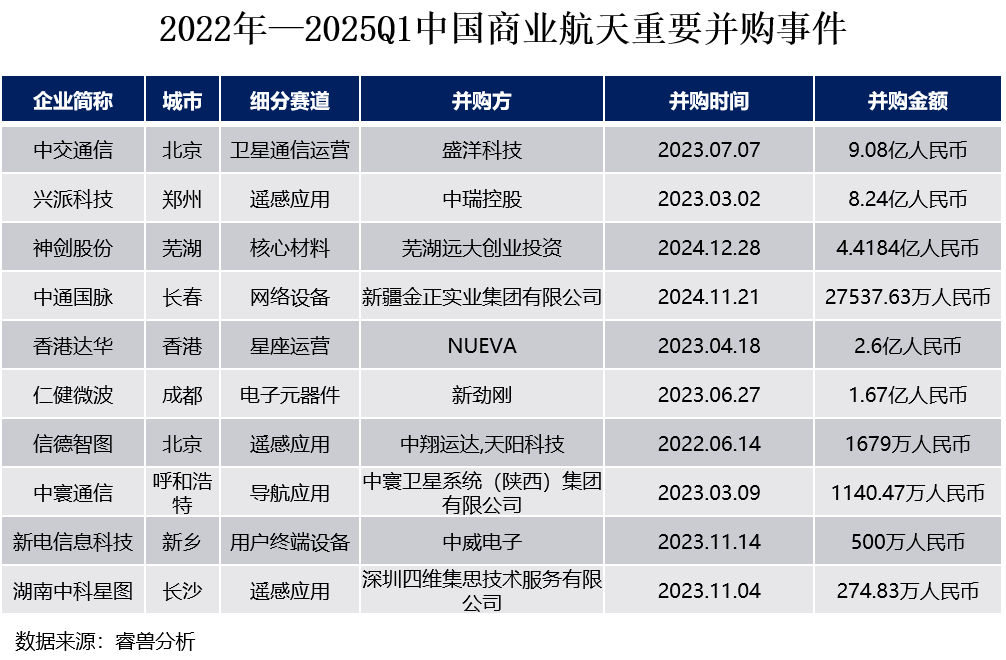 卫星应用。在2022年-2025Q1,国内有22家商业航天企业发生并购事件,披露总额40亿元人民币,赛道集中在卫星应用领域的导航应用(4家)和遥感应用(3家)。2024年发生5次收并购事件,披露融资金额7.17亿元;2025Q1发生2次并购事件。