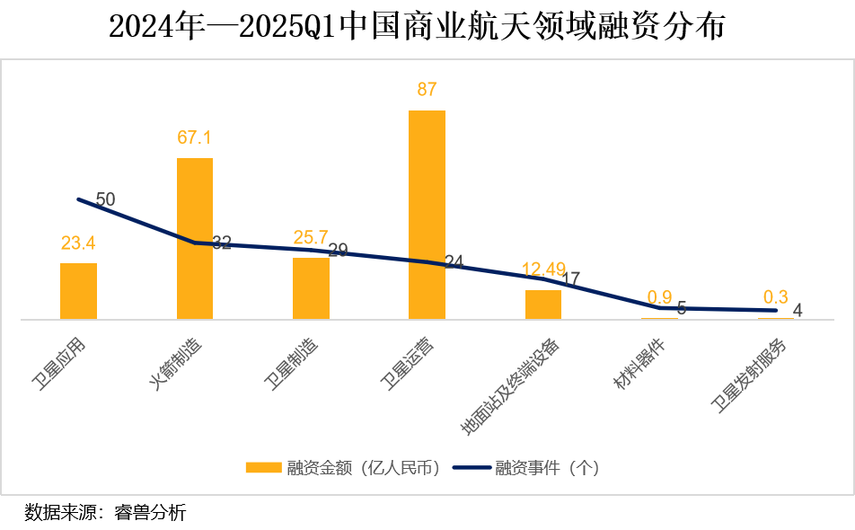 卫星应用、火箭制造、卫星制造保持较高热度。2024年-2025Q1融资事件数量上,卫星应用、火箭制造、卫星制造位列前3名,完成融资事件29个及以上;卫星运营、火箭制造因发生大额融资事件导致披露金额较高,均在65亿元以上,如垣信卫星获得67亿元人民币融资,科工火箭、天兵科技、星河动力、蓝箭航天均获得过10亿元融资。