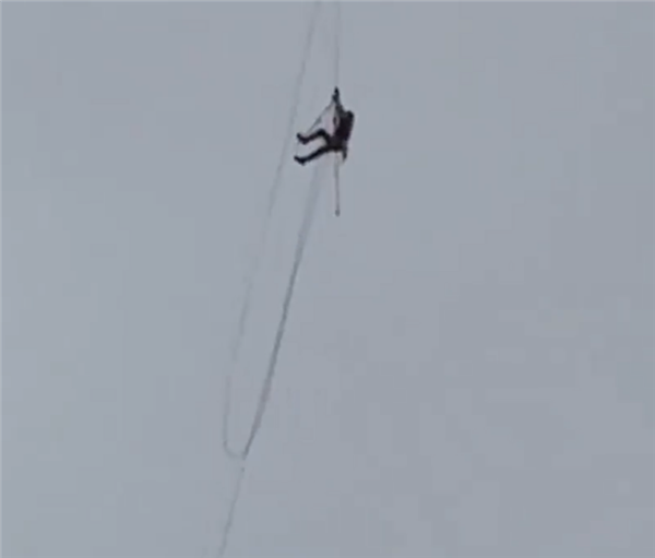 从视频画面来看,男子高悬于半空,仅靠一条细长绳索吊挂,身下是密密麻麻的高楼与街道,尽管风力不小,他仍在半空中 “随风摇摆”,动作毫不慌张,甚至颇有 “表演” 意味,手里还拿着自拍杆,显然是在拍摄自己的所作所为。