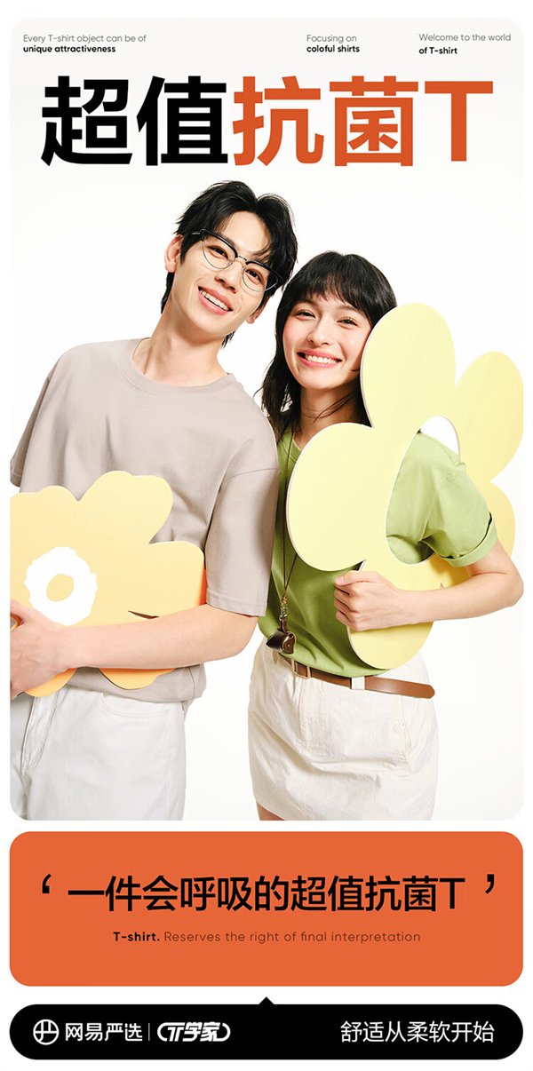 网易严选纯色纯棉 10A 短袖 T 恤,日常售价为 59 元,今日下单 3 件,立减 78 元,领取 8+8 元优惠券,到手价为 83 元,折合每件约 27.66 元。