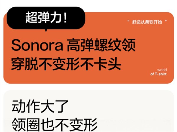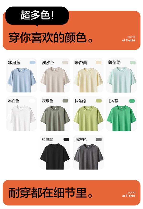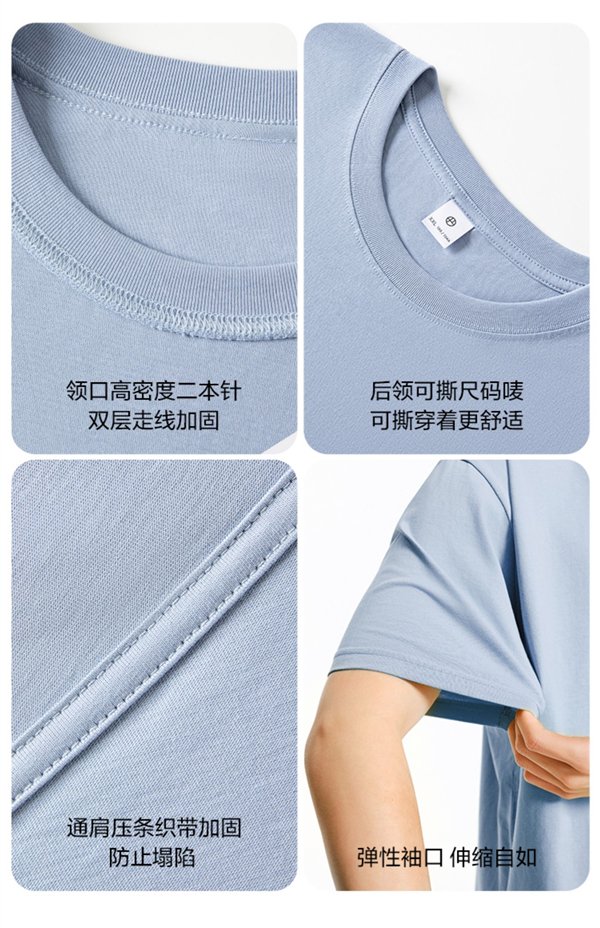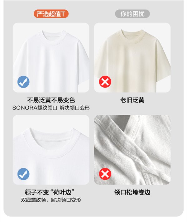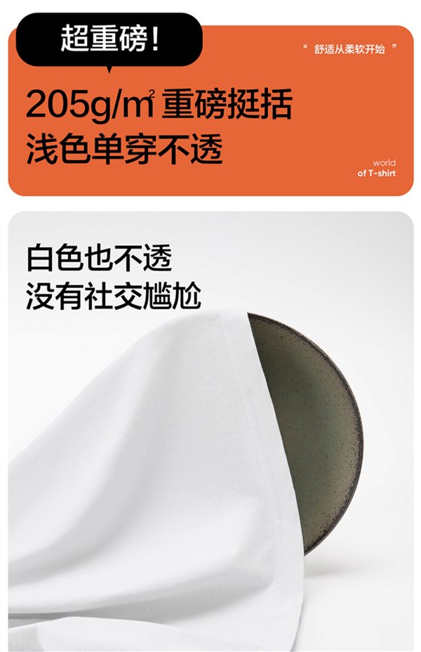 205g/m2 重磅挺括,浅色单穿不透,白色也不透,Sonora 高弹螺纹领,穿脱不变形不卡头,动作大了领圈也不变形。