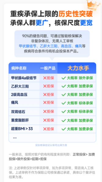 在AI赋能下,水滴保基于多年行业实践,依托长期积累的保险预核保、疾病协赔、健康增值服务等丰富的数据集,联合保险公司推出了多款覆盖慢病人群的医疗险和重疾险,能够为产品设计提供更多维度的参考,更好地把握风控。
