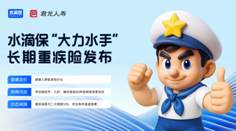 4月23日,水滴保联合君龙人寿正式发布“健康投保价低、带病可买可赔”的高性价比长期重疾险——“大力水手”,该产品不仅为健康人群提供了低价方案,针对带病人群更是大幅降低投保门槛,核保尺度突破历史,首次将甲状腺结节4a级、乙肝大三阳等19种传统拒保疾病纳入可承保范围,并创新推出“动态健康激励机制”,重疾保额有机会二次增额10%,或直接降费。目前,大力水手已在水滴保、深蓝保、学霸说保、奶爸说保等平台上线推广。
