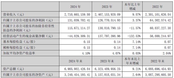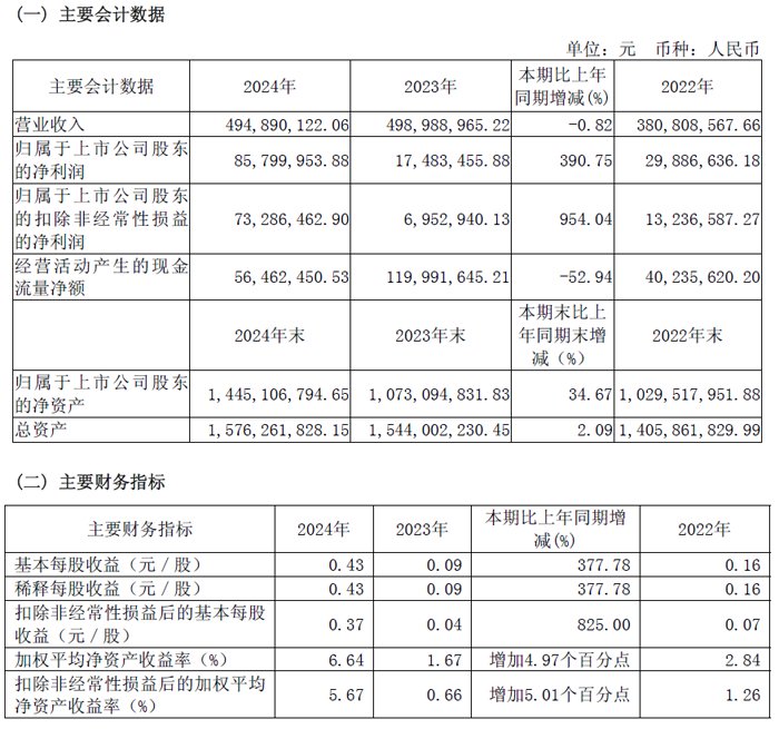 2024年度,上海飞凯材料科技股份有限公司发布2024年年度报告。2024年度,公司实现营业收入29.18亿元,同比上升6.92%;实现归母净利润为2.47亿元,同比增长119.42%;实现扣非净利润为2.40亿元,同比增长379.65%。