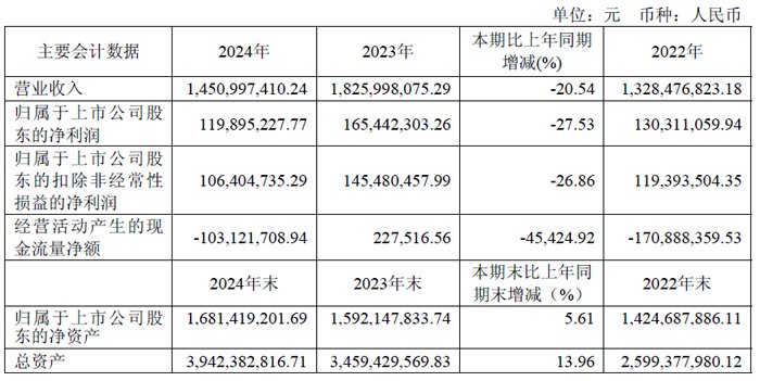 2024 年,上海盛剑科技股份有限公司营业总收入为14.51亿元,同比下降20.54%;营业利润为13,715.28 万元,利润总额为13,561.17万元,归母净利润为11,989.52 万元,同比下降27.53%。