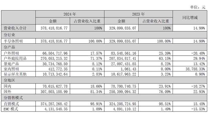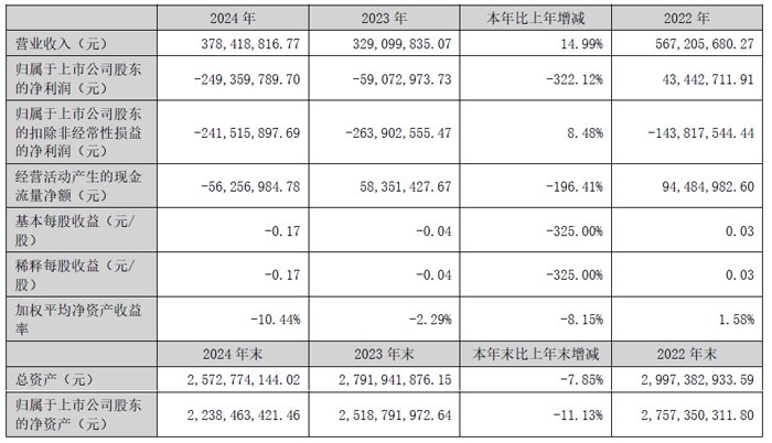 报告期内,东莞勤上光电股份有限公司发布2024年年度报告。2024年度,公司实现营业收入3.78亿元,同比上升14.99%,公司整体实现营业利润亏损2.46亿元,同比下降295.33%;实现利润总额为亏损2.48亿元,同比下降284.21%;实现归母净利润为亏损2.49亿元,同比下降322.12%。
