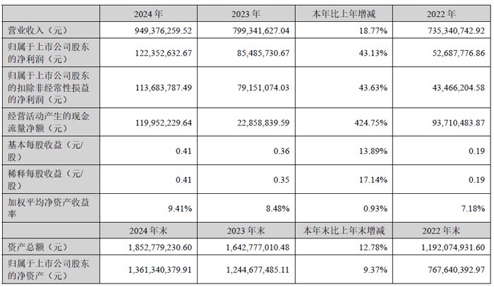 深圳市容大感光科技股份有限公司发布2024年年度报告。报告期内,公司管理层按照经营计划,稳步推进各项业务发展。公司的营销服务能力进一步提升,资产规模及盈利能力也得到进一步增强,公司业绩较上年同期略有增长。报告期内,公司实现营业收入为9.49亿元,比去年同期增长18.77%;营业利润14,178.46 万元,比去年同期增长46.00%;归母净利润为12,235.26 万元,比去年同期增长43.13%;基本每股收益为0.41 元,比去年同期上升13.89%。报告期内,公司研发费用为5,180.21 万元,占营业收入的5.46%。