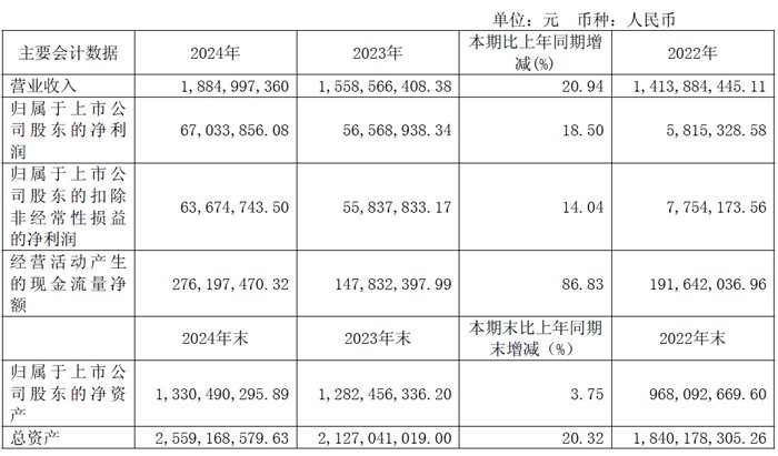 4月23日晚间,上海晶华胶粘新材料股份有限公司发布2024年年度报告。报告期内,公司实现营业收入18.85亿元,较上年期增长20.94%;本期毛利率为17.09%,较上年同期增加0.74 个百分点;归母净利润为6703.39 万元,较上年同期增长18.50%;2024 年经营活动产生的现金流量净额为27,619.75 万元,较上年同期增长86.83%。