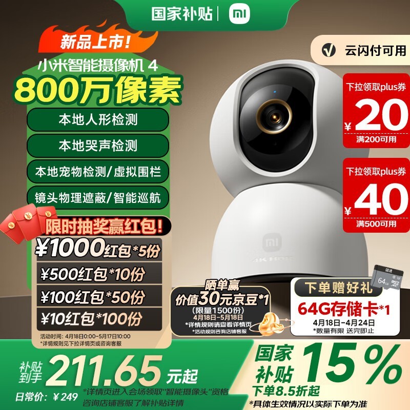 小米Xiaomi智能摄像机4 MJSXJ27CM高清家用监控摄像头仅159元