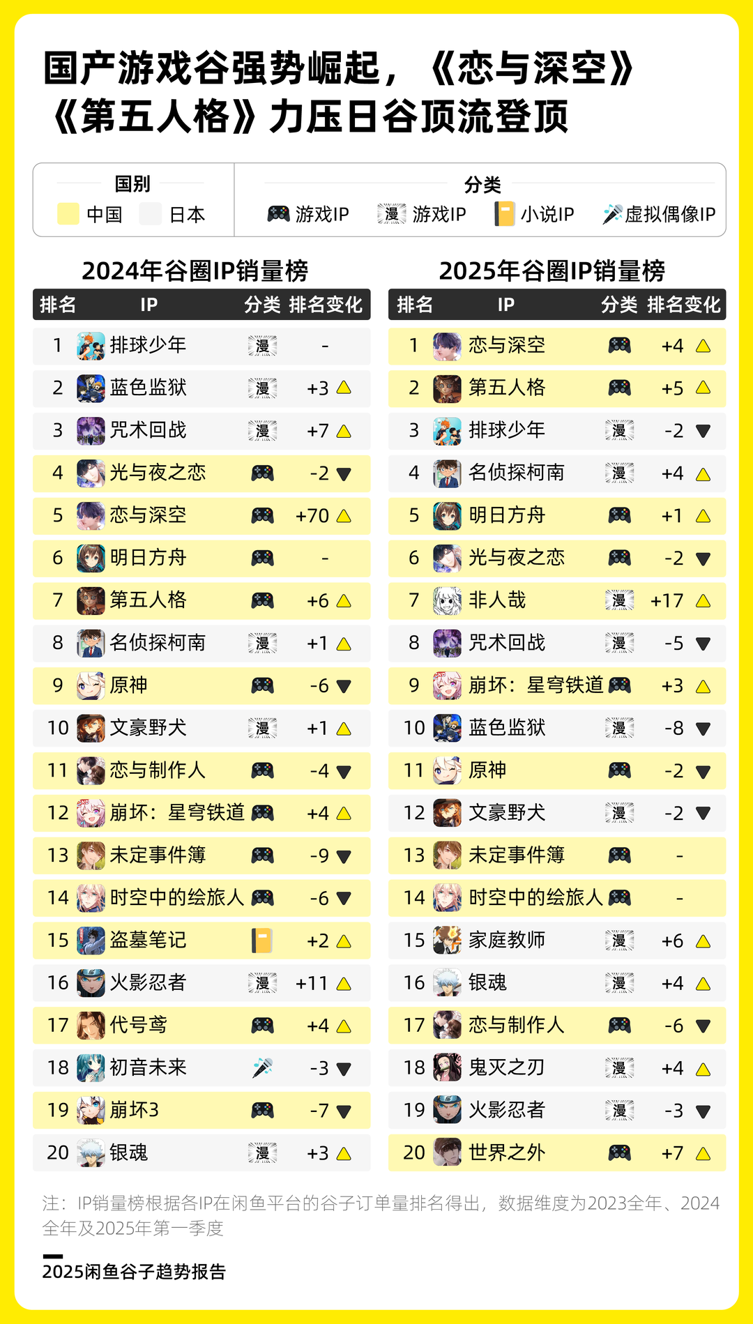 从IP销量情况来看,国产游戏表现尤为亮眼,连续两年占据谷圈十大IP销量榜的半壁江山。2025年第一季度,国产女性向游戏《恋与深空》和手游《第五人格》销量登顶,强势超越去年大爆的日谷“顶流”《排球少年》《蓝色监狱》和《咒术回战》,成为时下最热门的谷圈IP。