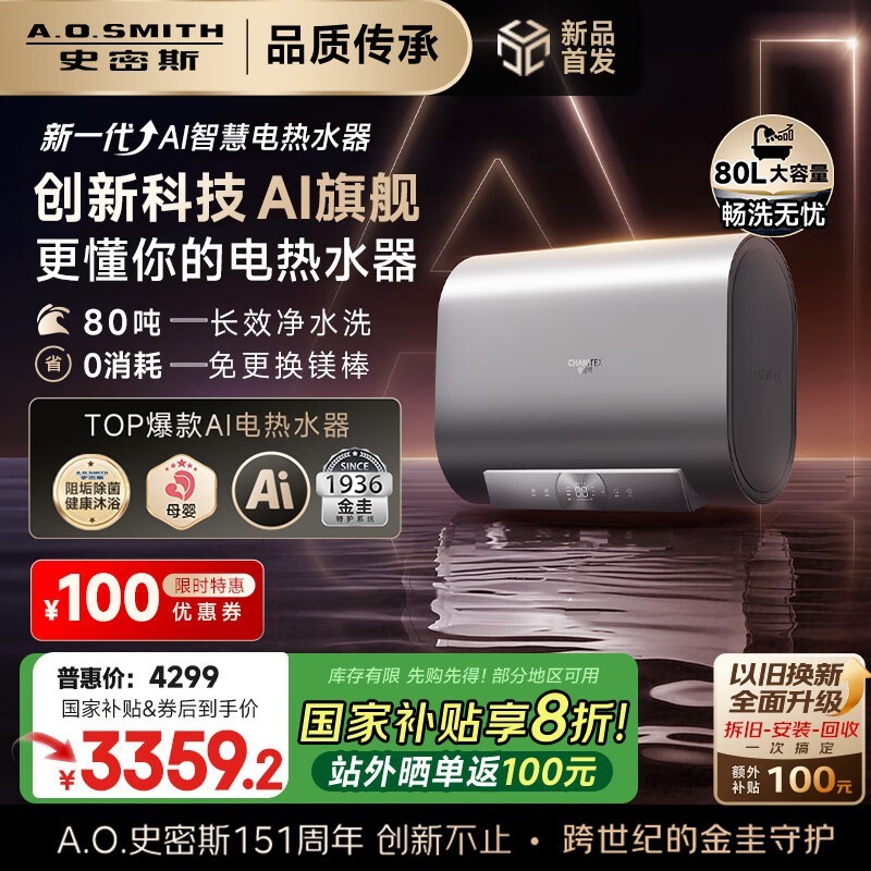 史密斯80升电热水器超薄双胆京东优惠价3313元