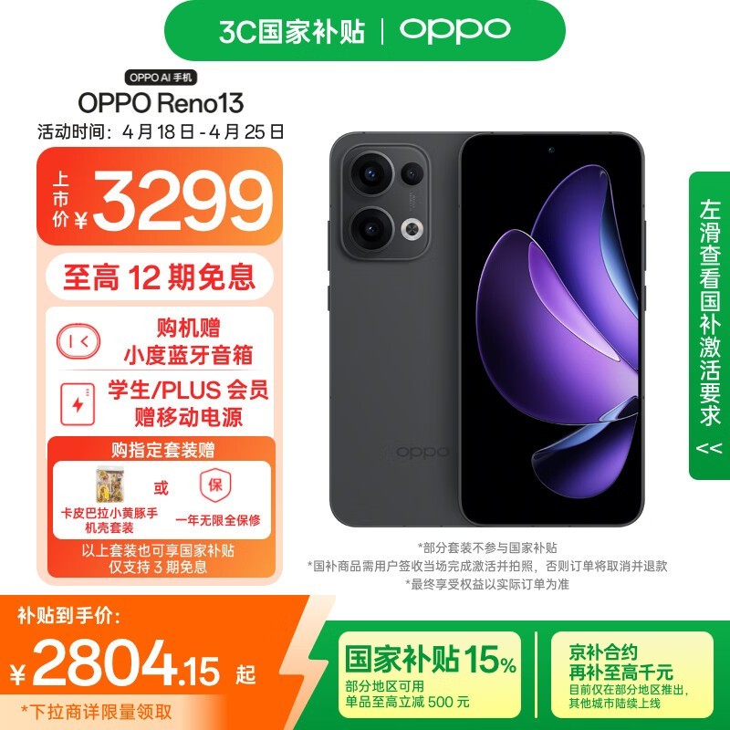 OPPO Reno13 5G手机16GB+512GB午夜黑京东特惠3259元