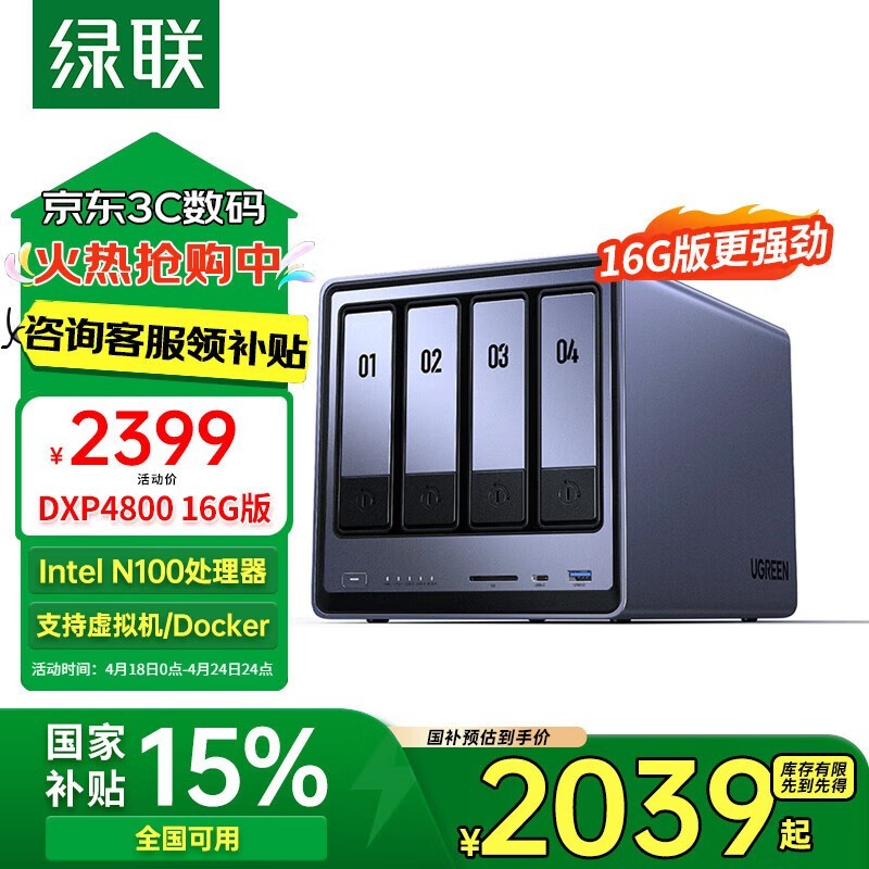 绿联DXP4800四盘位NAS存储N100空盘版强劲性能低至1994元