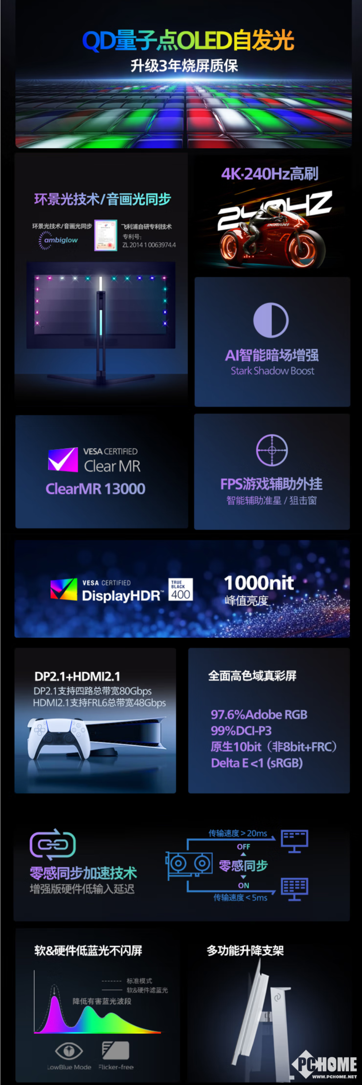 Evnia 27M2N8800外观沿用了飞利浦Evina系列产品的经典设计,采用了三面超窄边框设计,支持ambiglow环景光技术,带有三边灯珠和条形灯带。Evnia 27M2N8800提供了两个HDMI 2.1接口、一个满血的DP 2.1接口、以及一个3.5mm音频插孔,同时还带有集线器功能,提供了两个USB 3.2 Gen1 Type-A接口,支持PIP/PBP功能,另外还配有双5W扬声器。其配备了符合人体工程学的支架,支持0mm至130mm升降、-5°至20°俯仰和-30°至30°侧转调节,以灵活适配多场景使用,同时也兼容VESA规格(100 x 100 mm)的壁挂式安装,便于玩家使用悬臂支架。