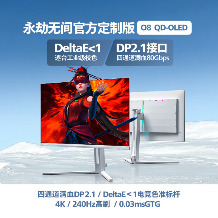 Evnia 27M2N8800采用了26.5英寸的QD-OLED面板,原生10bit色深,可视角度为178度(水平和垂直),分辨率为3840 x 2160,刷新率为240Hz,响应时间(GtG)为0.03ms,峰值亮度为1000尼特,DCI-P3色域为99%,Adobe RGB色域为97.5%,sRGB色域为100%,DeltaE<1,支持Adaptive Sync技术,得到了ClearMR 13000和DisplayHDR True Black 400认证。