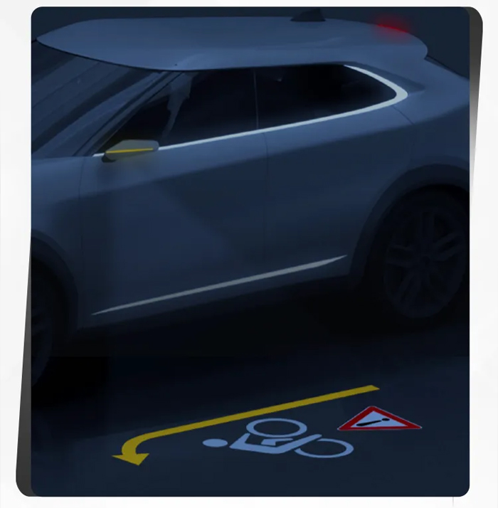 此次马瑞利推出的全彩流媒体近场投影技术可实现动态彩色地面投影。相应模块安装在车身的前、后及侧面,可呈现 360°全方位照明效果。这一革命性的技术不仅显著提高车辆安全性,也进一步增强了车辆与用户及其他交通参与者之间的智能交互体验。在安全方面,该产品可实时投射清晰的彩色警示标识,提醒周围车辆和行人注意车辆转向、倒车、急刹和下客等行为,有效提高出行安全性,在智能交互方面,动态投影可实时呈现车辆智驾状态、电量信息、续航里程以及车主联系方式二维码,使人车之间互动更便捷、直观。此外,在个性化定制方面,车灯还支持投影迎宾光毯,甚至电影或互动游戏等个性化投影内容,满足用户对车辆个性化表达和场景娱乐的需求。
