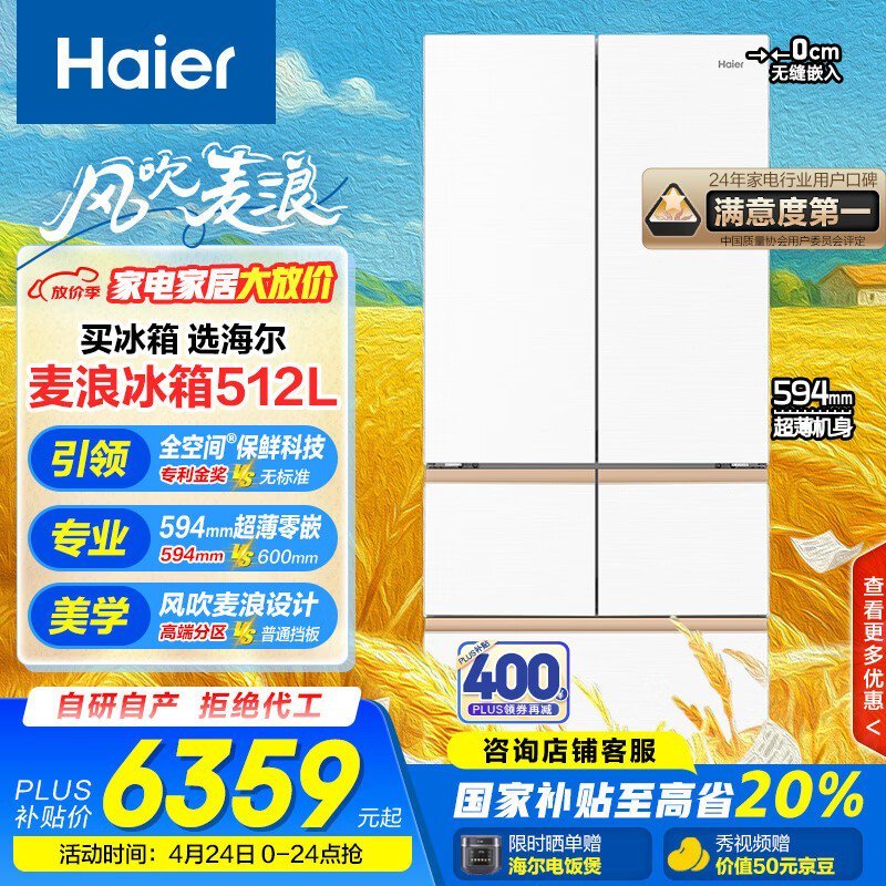 海尔512L麦浪系列白色风冷冰箱京东优惠