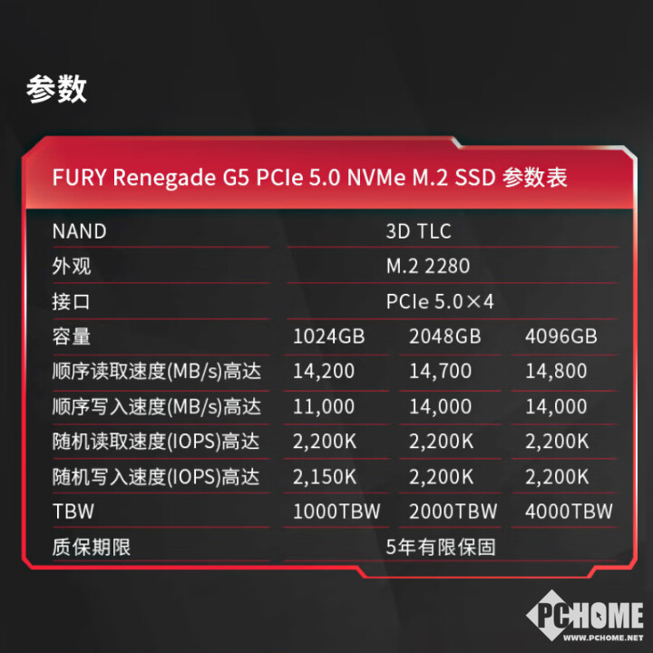 FURY Renegade G5采用M.2 2280外形规格和12层PCB设计,采用了3D TLC NAND闪存与台积电6nm制程慧荣SM2508主控,配备LPDDR4外置DRAM缓存。性能方面,FURY Renegade G5顺序读写至高可达14.8GB/s和14GB/s,随机读写至高可达2200K IOPS和2200K IOPS。