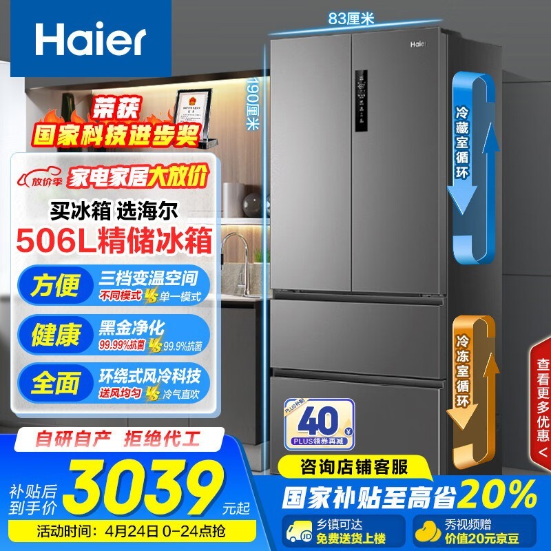 海尔506L风冷多门冰箱博卡灰 大容量囤货必备