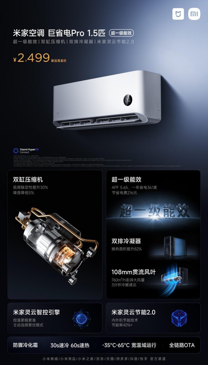 米家空调 巨省电Pro 2025系列1.5匹挂机拥有30秒速冷、60秒速热的强大实力。不管是夏日午后让人难受的闷热,还是冬日清晨的丝丝寒意,开启后,舒适温度迅速遍布房间。米家空调 巨省电Pro 2025系列升级了同级别唯一的双缸压缩机,对比单缸压缩机,低频稳定性提升30%,噪声降低5%。米家空调 巨省电Pro 1.5匹在能效水平,AI智能化得到了全方位的提升,让制冷效果、电耗水平、温度舒适程度三个重要性能维度得到全面提升。米家空调 巨省电Pro 1.5匹APF 高达5.65,超越目前国标一级能效标准的APF 5.0,实现更好的制冷制热效果同时,节约更多的电能。