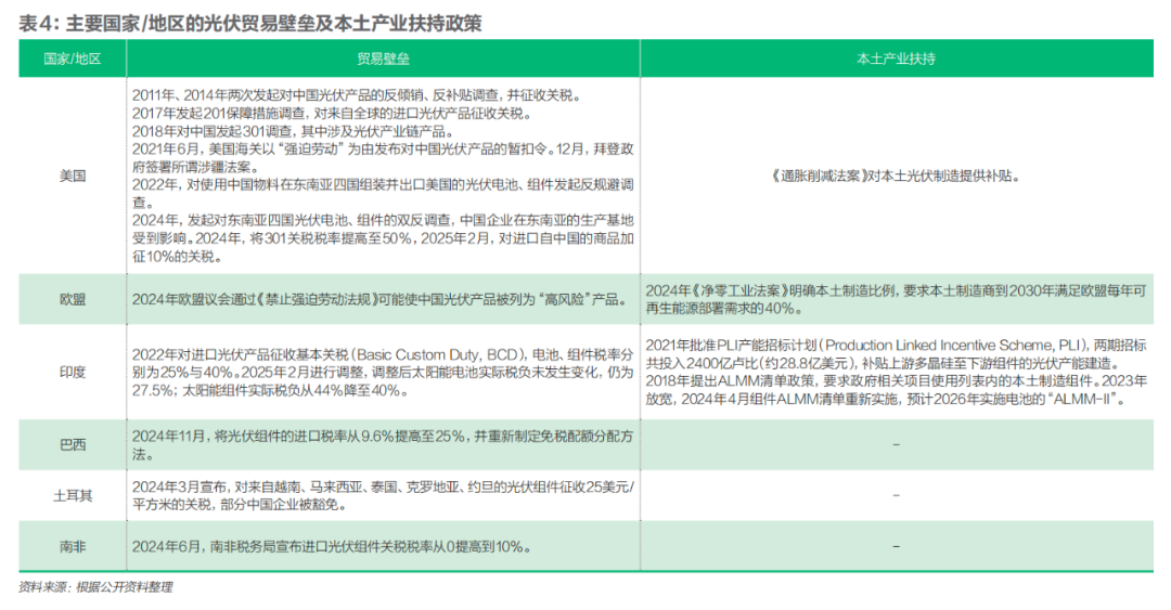 由于中国光伏制造的能力过于强大,海外的本地制造几乎没有竞争力。近年来,美国、印度、欧盟等开始重估中国光伏,对中国产品设置了不同类型、不同程度的贸易壁垒,并试图发展本土光伏制造。