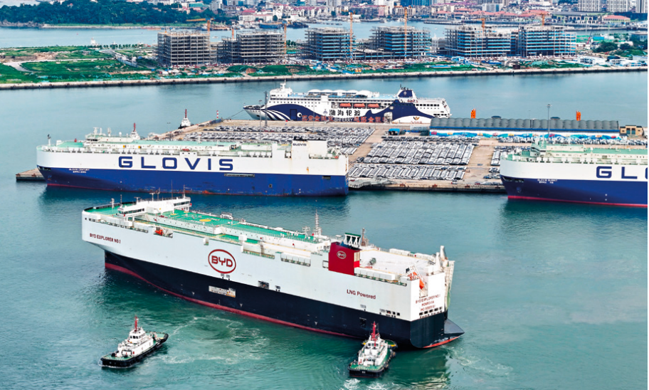 2024年7月5日,比亚迪“开拓者1号”滚装船在烟台港装载新能源汽车,准备发往欧洲。图/视觉中国