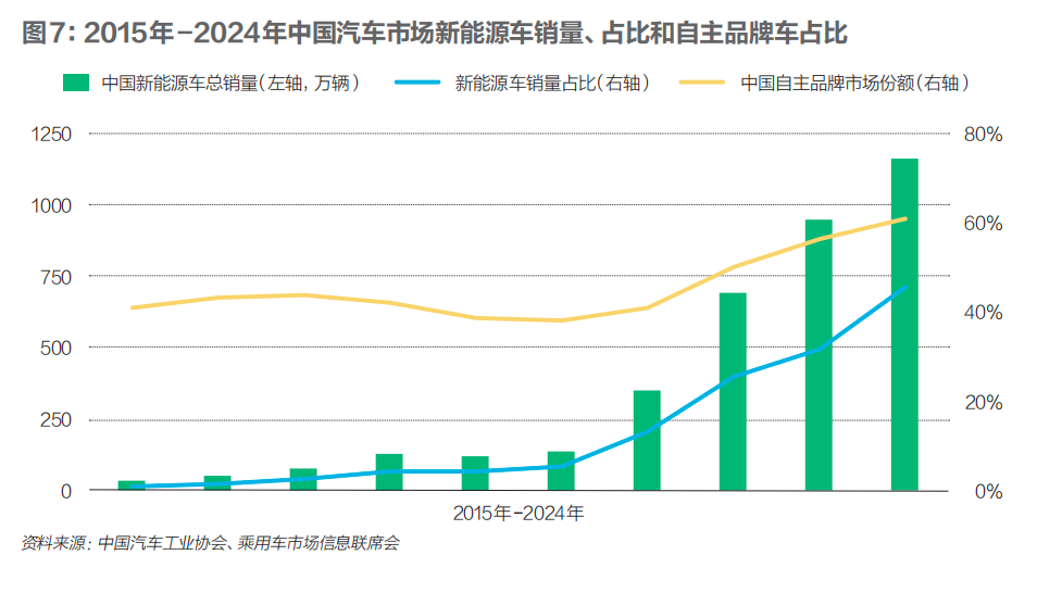 新能源车起飞还同步提升了中国自主品牌的市场份额。从2020年到2024年,五年时间,中国自主品牌在国内市场的占比从38.4%增长到60.5%。而2019年之前,虽然新能源车在增长,但中国自主品牌的市场份额却在小幅下降。