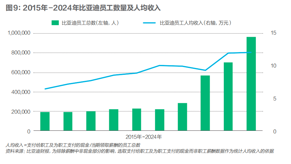 从2015年到2020年,比亚迪的雇员总数一直徘徊在20万人左右,2015年到2020年人均收入从6.42万元增加到10.04万元。2020年比亚迪走出低谷,到2024年,比亚迪员工数达到96.8万人,人均收入超过12万元,十年间增长87.5%。与之相比,2015年到2024年,中国城镇居民人均可支配收入从3.1万元增长至5.4万元,十年间增长74.2%。但与同期营收增长9.7倍、利润增长14.3倍对照,比亚迪员工收入的增长明显滞后。