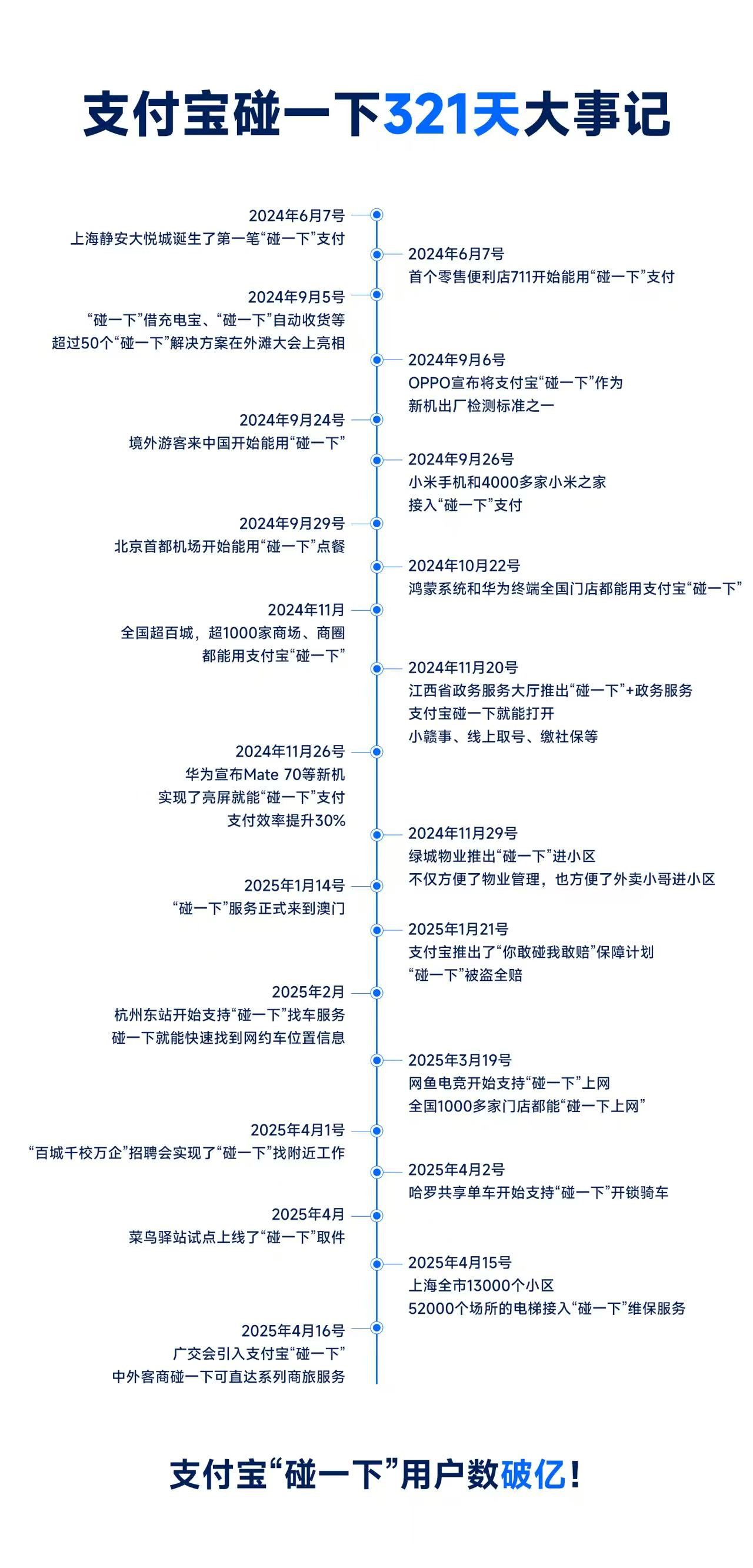 2024年7月,支付宝在开放日活动中宣布推出“支付宝碰一下”,允许用户不展示付款码,而是解锁手机并触碰商家收款设备,来快速完成支付。此后,该功能向在中国的境外宾客开放,同时上线中英文页面和英语语音播报服务,最早在成都太古里落地。