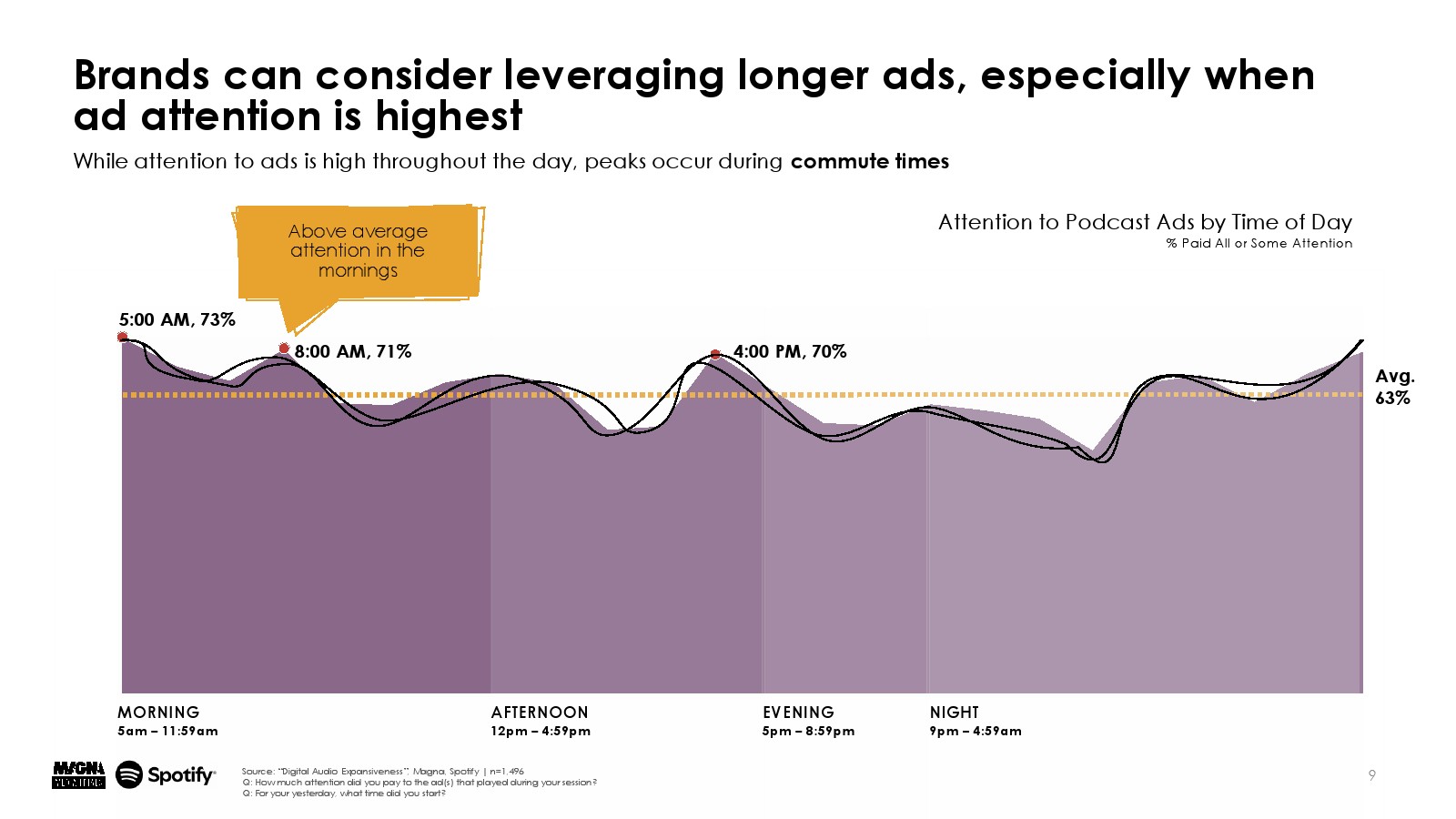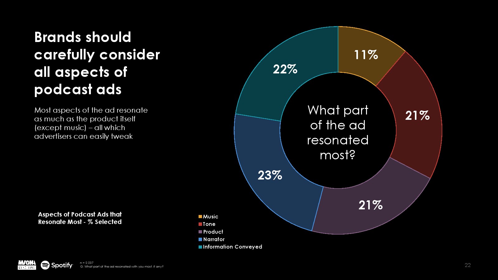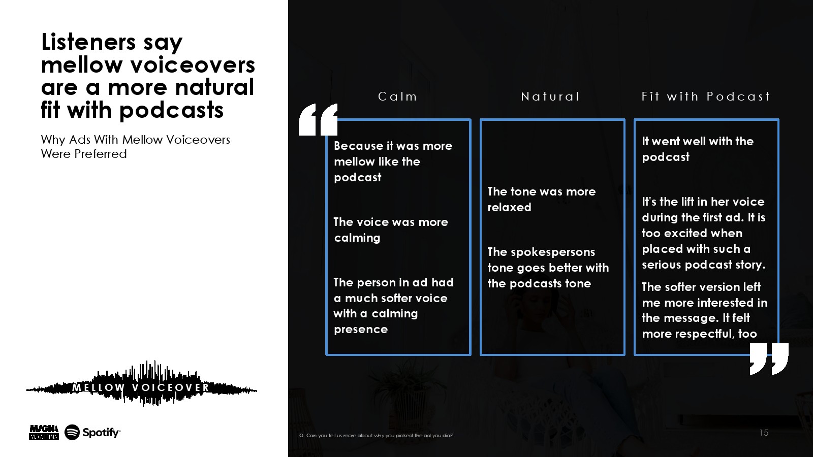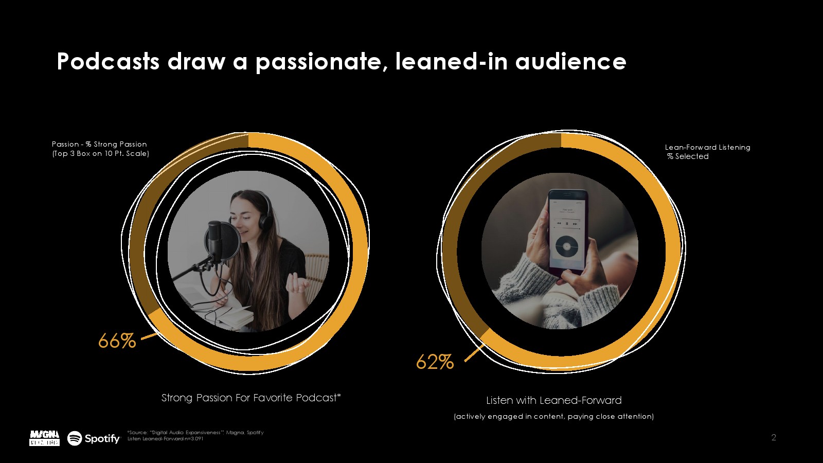 MAGNA Media Trials的研究强调,播客拥有高度投入、倾身向前的听众,62%的听众积极参与内容并密切关注;66%的听众对他们最喜欢的播客表达了强烈的热情——这是营销人员应该利用的两个重要因素。听播客是一种身临其境的体验,通过内容和广告吸引听众的注意力。