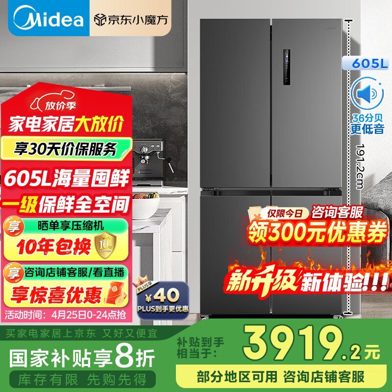 美的605L十字对开门冰箱到手价3711元