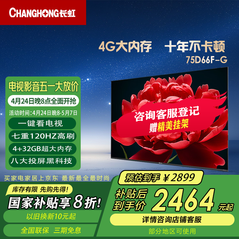 长虹75D66f-g电视,75英寸4K超清仅2464元