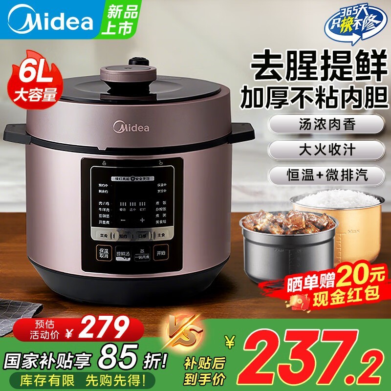 美的6L电压力锅,原价299元现到手191元